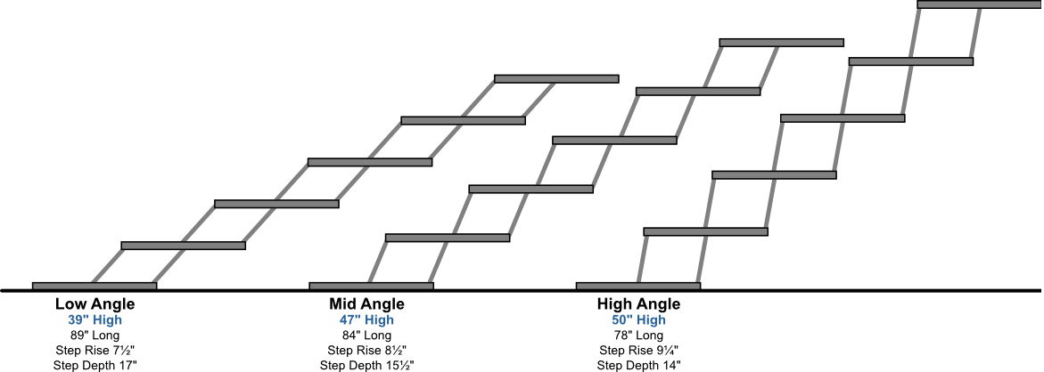 Besides platform material, choose the number of steps (3, 4, 5, or 6) that is right for for the height of your vehicle. Measure vehicle from the pavement to where your pet will enter the vehicle such as the cargo floor, seat, truck bed, etc. then see our height chart below. Keep in mind the opening width, especially for passenger door openings, as they tend to be more narrow.